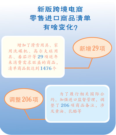 此次調(diào)整,在《跨境電子商務零售進口商品清單(2019年版)》基礎上,增加了滑雪用具、家用洗碟機、高爾夫球用具、番茄汁等29項近年來消費需求旺盛的商品,涉及食品、家用電器、運動用品等多類別,清單商品數(shù)達到1476個。