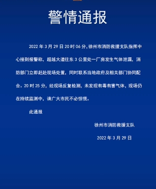 徐州市消防救援支隊(duì)在當(dāng)晚24時(shí)左右發(fā)布的警情通報(bào)中表示,3月29日20時(shí)06分,徐州市消防救援支隊(duì)指揮中心接到報(bào)警稱,超越大道往東3公里處一廠房發(fā)生氣體泄露,消防部門立即趕赴現(xiàn)場(chǎng)處置,同時(shí)聯(lián)系當(dāng)?shù)卣跋嚓P(guān)部門協(xié)同配合。20時(shí)25分,經(jīng)現(xiàn)場(chǎng)反復(fù)檢測(cè),未發(fā)現(xiàn)有毒有害氣體,現(xiàn)場(chǎng)仍在持續(xù)監(jiān)測(cè)中。