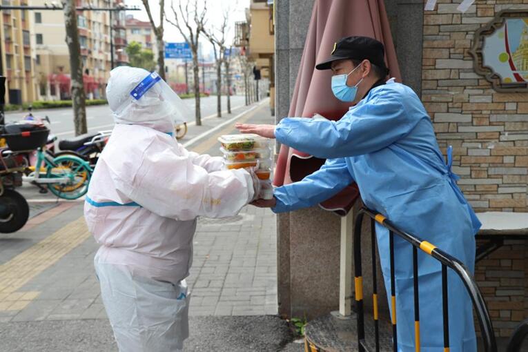 人民網(wǎng)上海4月1日電 (葛俊俊)上海浦西核酸篩查首日。上午10:00,送餐員馬俊紅和張紅喜帶著剛剛出鍋的230份助老餐出發(fā)了。