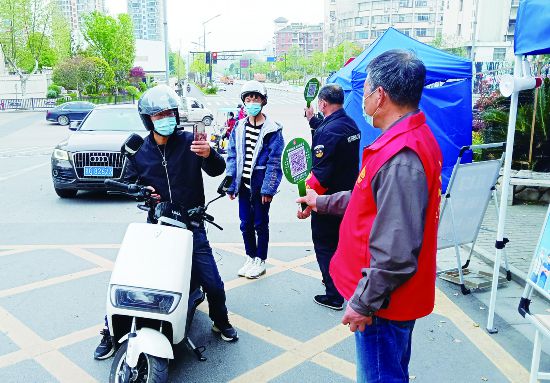4月5日,在金華婺城區(qū)城東街道通園路社區(qū)各暖心服務(wù)點(diǎn)、小區(qū)出入口,管理人員落實(shí)測(cè)溫、亮碼、戴口罩的要求,“場(chǎng)所碼”逢進(jìn)必掃,社區(qū)自行設(shè)計(jì)了便攜式“掃碼桿”。使用“掃碼桿”后,過(guò)往車輛和行人掃碼的效率明顯提高,縮短了通過(guò)時(shí)間,拉開了志愿者和來(lái)往車輛及人員的距離,避免人員接觸。(時(shí)寬兵)