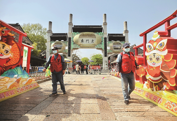 為保障旅游市場有序、游客健康平安,南京老門東景區(qū)嚴(yán)抓疫情防控。圖為昨日早晨,景區(qū)工作人員在對公共場所進(jìn)行消殺,為游客到來做好準(zhǔn)備。 本報(bào)記者 范俊彥 攝