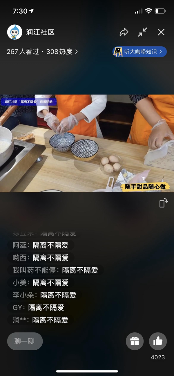 在這個(gè)特殊的“戰(zhàn)疫”時(shí)刻,潤(rùn)江社區(qū)依舊在3月29日-4月3日6天時(shí)間里陸續(xù)推出了包括心理疏導(dǎo)課程、健身指導(dǎo)課程、烘焙分享、家庭收納、親子共讀和感悟分享在內(nèi)的直播內(nèi)容。截至目前,“小杜直播間”已經(jīng)吸引了社區(qū)內(nèi)近1500人次觀看,這些直播內(nèi)容貼合了社區(qū)居民的需求,從各方面為居民緩解居家的焦慮、豐富居民的居家生活。