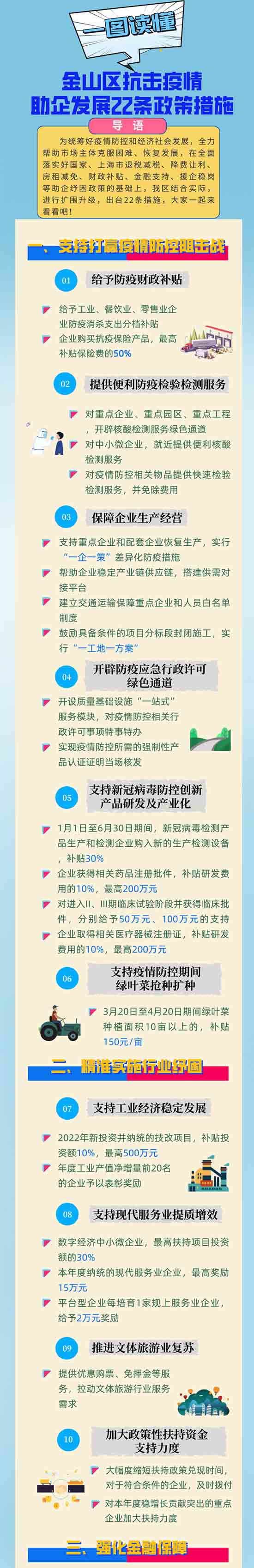 據(jù)悉,為統(tǒng)籌好疫情防控和經(jīng)濟社會發(fā)展,全力幫助市場主體克服困難、恢復發(fā)展,在全面落實好國家、上海市退稅減稅、降費讓利、房租減免、財政補貼、金融支持、援企穩(wěn)崗等助企紓困政策的基礎上,結合金山實際,進行擴圍升級,制訂《金山區(qū)抗擊疫情助企發(fā)展22條政策措施》?!?2條”既聚焦企業(yè)當前面臨的“難點”“痛點”“堵點”,又考慮到疫情后企業(yè)加快發(fā)展的各項訴求,共計包括六大方面內容,即支持打贏疫情防控阻擊戰(zhàn)、精準實施行業(yè)紓困、強化金融保障、開展援企穩(wěn)崗、減輕企業(yè)負擔及優(yōu)化提升服務,用實實在在的舉措,精準幫助市場主體紓困解難,穩(wěn)定經(jīng)濟增長。