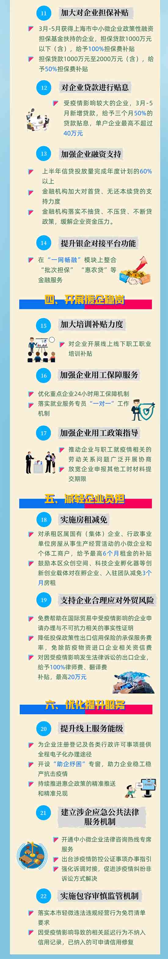 疫情階段,不少中小微企業(yè)反映出現(xiàn)融資難、融資貴問題,“22條”在強化金融保障方面,提出加大對企業(yè)擔保補貼、對企業(yè)貸款進行貼息、加強企業(yè)融資支持及提升銀企對接平臺功能等4條措施。比如,3月-5月獲得上海市中小微企業(yè)政策性融資擔?;鸱龀值钠髽I(yè),擔保貸款1000萬元以下(含),給予100%擔保費補貼擔保貸款1000萬元至2000萬元(含),給予50%擔保費補貼;受疫情影響較大的企業(yè),3月-5月新增貸款,給予三個月50%的貸款貼息,單戶企業(yè)最高不超過40萬元。同時,高效處理企業(yè)“批次擔?!睒I(yè)務申請,推動銀行讓利,積極為“白名單”企業(yè)爭取額外融資額度,3月已幫助企業(yè)成功獲得23783萬元貸款授信。此外,完善銀企對接平臺,推動實現(xiàn)不見面申請,在“一網(wǎng)暢融”平臺上推動整合“批次擔?!钡冉鹑诜眨壳耙延?1家銀行及其105個金融產(chǎn)品入駐平臺,提升融資服務效率,切實緩解了信貸供需信息不對稱問題。
