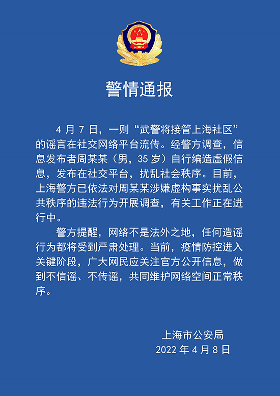 人民網(wǎng)上海4月8日電(王文娟)據(jù)上海市公安局通報:4月7日,一則“武警將接管上海社區(qū)”的謠言在社交網(wǎng)絡平臺流傳。經(jīng)警方調(diào)查,信息發(fā)布者周某某(男,35歲)自行編造虛假信息,發(fā)布在社交平臺,擾亂社會秩序。目前,上海警方已依法對周某某涉嫌虛構事實擾亂公共秩序的違法行為開展調(diào)查,有關工作正在進行中。