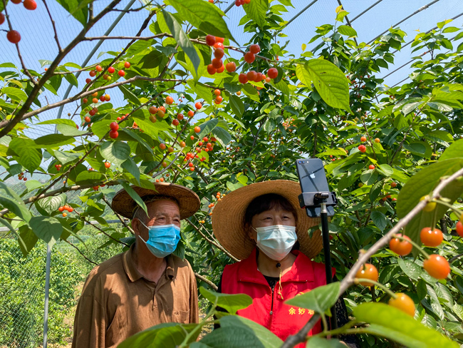近日,在金華市金東區(qū)赤松鎮(zhèn)虎巖村,“短柄”櫻桃成熟,猶如一盞盞小燈籠掛在枝條,村黨員志愿者網(wǎng)上幫助農(nóng)戶吆喝?;r村黨支部書記王基林介紹說,全村櫻桃種植面積1300多畝,品種有傳統(tǒng)的短柄、黑珍珠以及新引進(jìn)的紅妃,櫻桃銷售收入成為村民的一項(xiàng)主要經(jīng)濟(jì)來源,這幾天天氣晴好,櫻桃成熟快,一星期后上市量更大,采摘期持續(xù)到5月初。2022年為了防控新冠疫情,村黨支部組織黨員和志愿者把農(nóng)戶采摘的櫻桃派送到指定地點(diǎn),方便預(yù)訂的客戶拿取。(時(shí)寬兵)