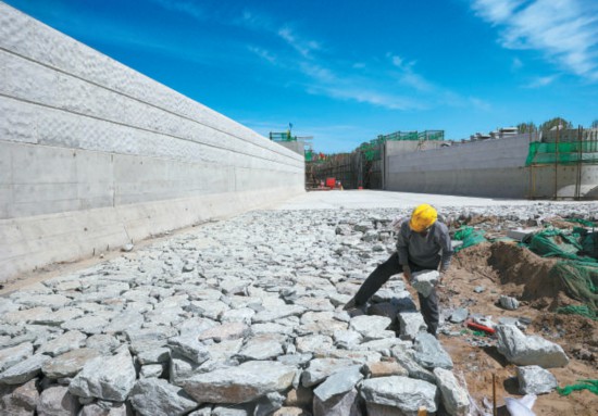 這些不規(guī)則的干砌石可以防止通水后河水掏刷建筑物,造成建筑物地基不穩(wěn)。本報(bào)記者 白繼開攝