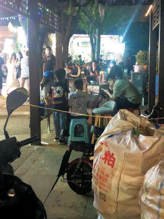 一路向西,類似的現(xiàn)象更是頻頻出現(xiàn),個別商家仍在做著“路邊攤”的生意。一名商戶告訴記者,因為點餐需要排隊,所以在便道上設(shè)置了等候區(qū),掃碼點餐時商戶已和顧客講明,只能點選打包帶走。記者眼見那些餐食果真裝進打包餐盒,送到了所謂的等候區(qū),可是顧客拿到手并未離開,打開餐盒立刻大快朵頤,顯然等候區(qū)只是給堂食外擺打了個掩護。