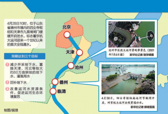 此次大運河全線貫通補水于4月14日啟動,以京杭大運河黃河以北707公里河段作為主要貫通線路,河北省境內(nèi)河長373公里,占補水總河長的53%。