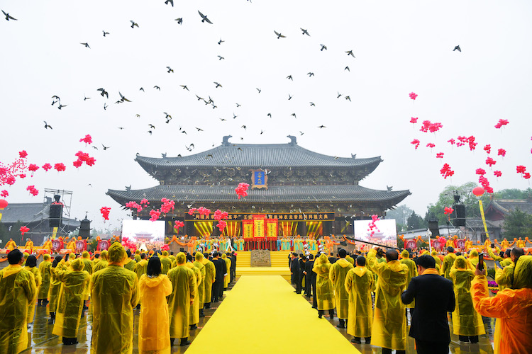 上午9時50分,拜祖大典正式開始。全體肅立,擊鼓九通、鳴鐘九響,恭啟圣門。莊嚴(yán)肅穆的炎帝大殿前,讀拜祖文,現(xiàn)場民眾行施拜禮。隨后,舉行了祭拜神農(nóng)炎帝的傳統(tǒng)儀式“敬十獻(xiàn)禮”,64名莘莘學(xué)子身著古代禮服敬獻(xiàn)“八佾舞”。甘霖細(xì)雨中,伴隨著《炎帝頌》磅礴激昂的歌聲,和平鴿振翅高飛、紅氣球騰空而起,在莊嚴(yán)祥和的氣氛中,大典禮成。
