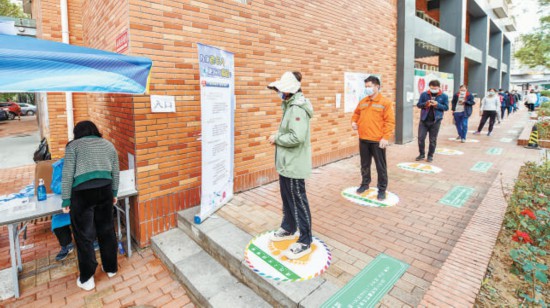 本報訊(記者 李瑤)昨天,東城區(qū)東四街道在轄區(qū)內(nèi)5個常態(tài)化核酸檢測點推出新式“兩米線”,通過充滿童趣的“呼啦圈”地貼,引導居民有序排隊,保持安全距離?!昂衾踩Α敝睆酱蠹s80厘米,中間黃色腳印圖案十分醒目,旁邊還印有疫情防控科普貼,居民站在圈內(nèi)有序排隊等待核酸檢測。“‘不僅富有童趣,使排隊等候不再那么乏味,還嚴格規(guī)定了排隊距離,保證大家的安全?!本用顸c贊說。本報記者 鄧偉攝