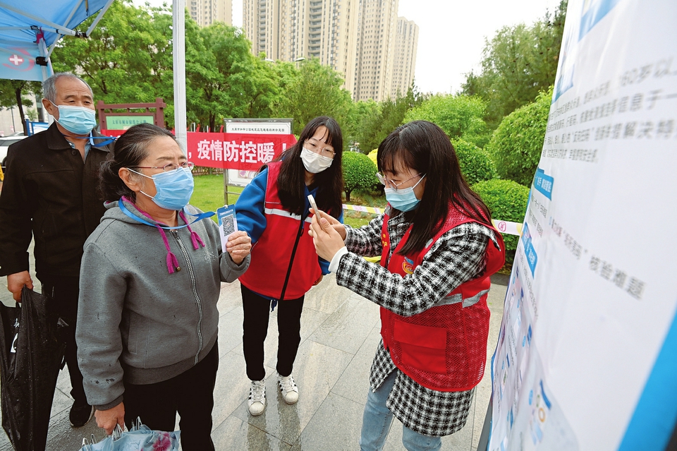 5月12日,太原市和平公園核酸檢測點,老年居民體驗“反向掃碼”帶來的便捷。據(jù)了解,常態(tài)化疫情防控下,為保障老年人和未成年人便捷出入公共場所,萬柏林區(qū)為60歲以上老年人及未成年人免費發(fā)放集健康碼、行程卡、核酸檢測報告等信息于一體的愛心碼出行卡,用“反向掃碼”新舉措解決特殊群體“亮碼”難題。(記者阮洋攝)