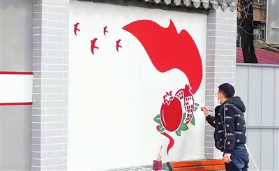 圖為專(zhuān)業(yè)人員對(duì)墻體進(jìn)行主題彩繪。朱明鑰 李朋林 攝影報(bào)道