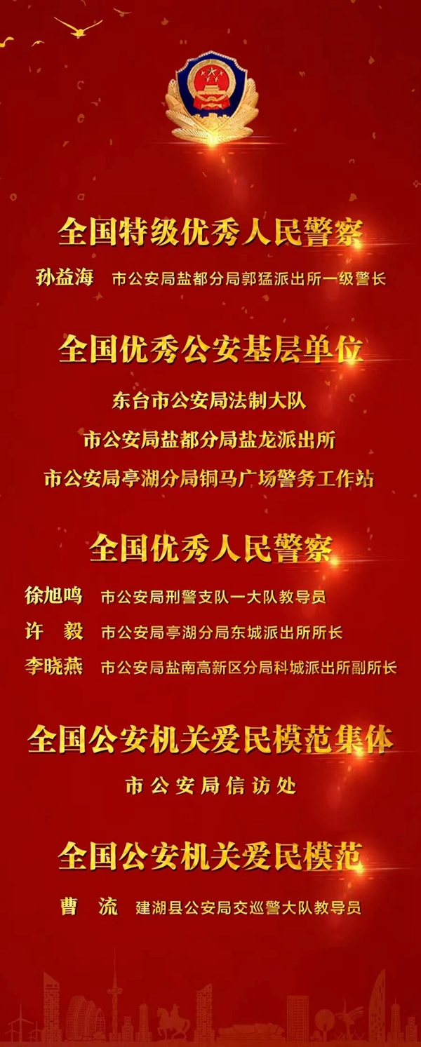 5月25日,全國公安系統(tǒng)英雄模范立功集體表彰大會上,江蘇鹽城公安1位民警被授予“全國特級優(yōu)秀人民警察”稱號、3個集體獲評“全國優(yōu)秀公安基層單位”、3名民警獲評“全國優(yōu)秀人民警察”,1個集體獲評“全國公安機(jī)關(guān)愛民模范集體”、1名民警獲評“全國公安機(jī)關(guān)愛民模范”。