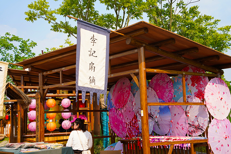 看罷演出,沿湖邊向東而行,是新近完善的“宋朝集市”?!盎㈩^鞋”“界首彩陶”“油紙傘”“古法燒制酒”等應(yīng)有盡有,“小販們”則身著古裝,起勁吆喝,兜攬生意,再現(xiàn)當(dāng)年宋朝集市的盛況。