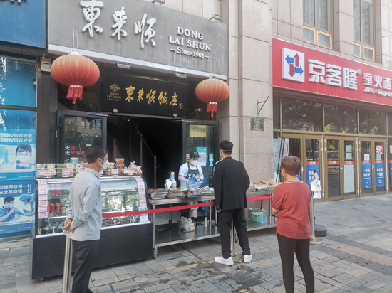 這個(gè)“五一”假期,老字號(hào)東來順王府井店不見了過往叫號(hào)等位的景象,取而代之的是服務(wù)員在門口引導(dǎo)、招呼顧客保持1米以上安全距離,有序排隊(duì)選購(gòu)?fù)赓u食品。