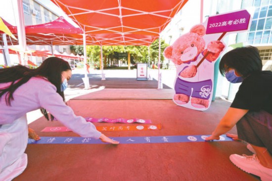 昨天上午,中國地質(zhì)大學(xué)附屬中學(xué)考點正在進行考點布置工作。兩米線上除了疫情提示,還印有“沉著冷靜 笑對高考”“自信認(rèn)真 分分必得”等祝福語。本報記者 王海欣攝
