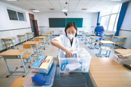 北京東直門中學(xué)考點(diǎn),老師正在展示考場(chǎng)配備的防疫物品箱,箱內(nèi)配備口罩、消毒酒精等防疫物品。 本報(bào)記者 潘之望攝