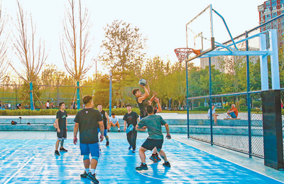 河北省石家莊市長安區(qū)拾光智慧體育公園里,市民正在打籃球。這座專業(yè)體育公園5月1日開放,以專業(yè)的運動設施和優(yōu)美的健身環(huán)境,吸引眾多市民前來鍛煉。近年來,各地大力新建改建體育場地設施,為全民健身全面開展夯實基礎。