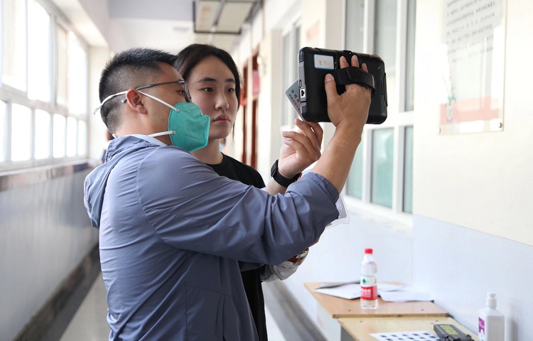 晉城市實(shí)驗(yàn)中學(xué),考場(chǎng)門(mén)口進(jìn)行身份證和人臉比對(duì)檢測(cè)。陳意茹攝