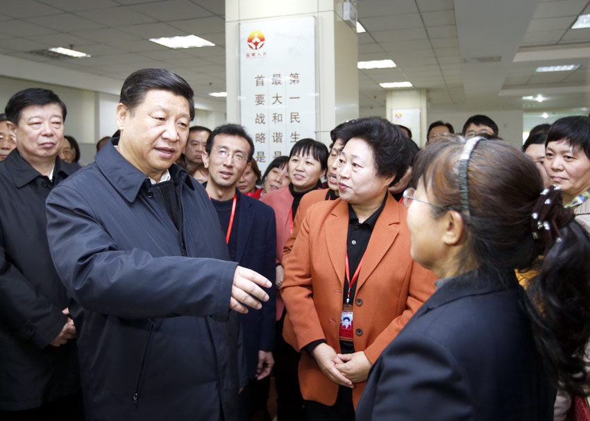 2013年11月27日下午,中共中央總書記、國家主席、中央軍委主席習近平在濟南市外來務(wù)工人員綜合服務(wù)中心同從事家政服務(wù)的“陽光大姐”交流。新華社記者鞠鵬攝