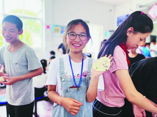 為什么會讓學(xué)生學(xué)做燒餅?zāi)??校長王國寶這樣解釋:“縉云燒餅的制作技藝是國家級非物質(zhì)文化遺產(chǎn),讓學(xué)生傳承這項技藝,也能讓他們感受縉云人記憶深處的味道。六年級的同學(xué)即將畢業(yè),以后他們會離開縉云展翅高飛,真心希望他們能記住縉云燒餅這個回家的路標(biāo)?!?/p>