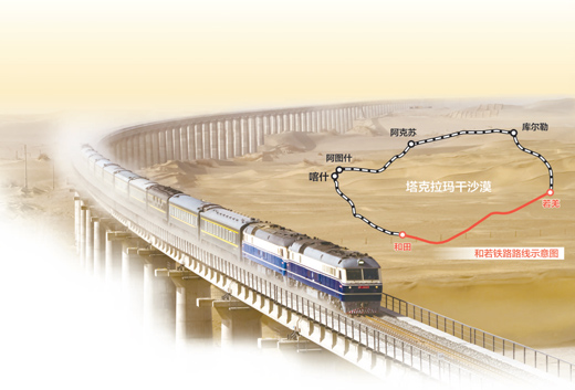 作為國(guó)家重點(diǎn)鐵路建設(shè)項(xiàng)目,和若鐵路西起新疆和田地區(qū)和田市,東至巴音郭楞蒙古自治州若羌縣,全長(zhǎng)825公里,設(shè)計(jì)時(shí)速120公里。和若鐵路開通后,與南疆鐵路、格庫(kù)鐵路相連,全長(zhǎng)2712公里,形成世界首個(gè)沙漠鐵路環(huán)線。