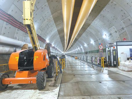 走進項目工地,沒有想象中的機械轟鳴聲,施工現(xiàn)場位于幾十米深的地下。記者從地面乘坐直梯,順著盾構(gòu)機始發(fā)井,來到地下26米處的西線隧道內(nèi)。國產(chǎn)最大直徑泥水平衡盾構(gòu)機“京華號”,已在西線隧道里向前掘進了近4000米。眼前的西線隧道,蜿蜒著向南延伸。開工初期,記者從始發(fā)井步行幾分鐘即可抵達(dá)盾構(gòu)機駕駛艙位置;這次采訪,施工方特意安排了1輛純電動代步車?!艾F(xiàn)在盾構(gòu)機離始發(fā)井有些遠(yuǎn),工作人員上下班都得坐車?!瘪{駛員說,這輛電動代步車是用吊車吊到隧道內(nèi)的,還特意為它在隧道里安了充電樁,“這輛車再回到地面,就得是隧道貫通的時候啦!”