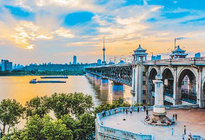 湖北武漢長江大橋,在晚霞的映照下,與長江構成一幅美麗的畫卷。趙廣亮攝(人民圖片)