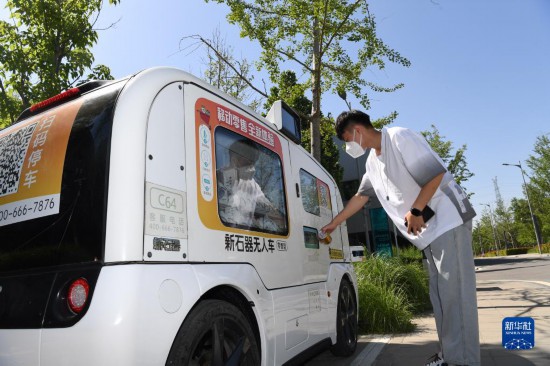 在雄安市民服務(wù)中心,市民在智能無人售賣車購買飲料(2022年5月27日攝)。新華社記者 朱旭東 攝