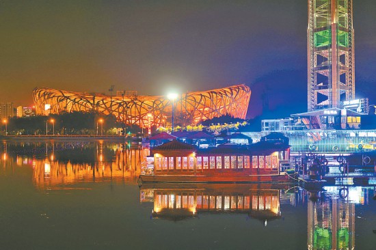 鳥巢北側(cè)的月色碼頭霓虹閃爍,濱水而建的月色碼頭已成為一處公園式消夏廣場。本報(bào)記者 潘之望攝