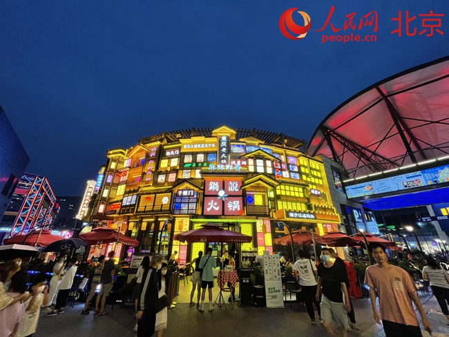 雖是工作日傍晚,剛過(guò)6點(diǎn),華熙LIVE·五棵松的街區(qū)上人已熙熙攘攘,要想嘗嘗網(wǎng)紅餐廳,已經(jīng)需要拿號(hào)等位了。順著香味一路走,一家裝潢極具重慶吊腳樓特色的火鍋店十分引人注目,成了夜景打卡地,飄香的麻辣味也勾起了不少食客的“饞蟲(chóng)”。