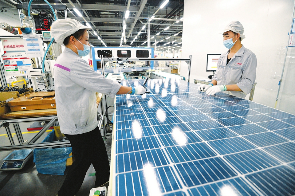 7月15日,大同隆基光伏科技有限公司光伏面板生產(chǎn)線上,工人們正在對產(chǎn)品進行最后檢測。該公司規(guī)劃布局了3條自動化生產(chǎn)線,引入目前行業(yè)內先進的生產(chǎn)設備和技術工藝。全部建成投產(chǎn)后,預計年產(chǎn)值約30億元。(記者李兆民攝)