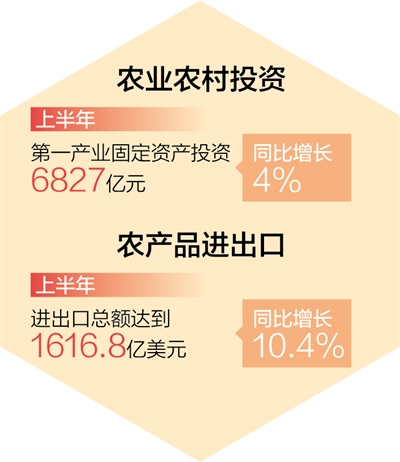 農(nóng)業(yè)農(nóng)村投資穩(wěn)步增長,農(nóng)村消費市場逐步恢復(fù)。農(nóng)業(yè)農(nóng)村投資渠道拓寬。落細落實扎實穩(wěn)住經(jīng)濟一攬子政策措施,全力推動重大政策落地實施和重大工程項目開工建設(shè)。上半年,第一產(chǎn)業(yè)固定資產(chǎn)投資6827億元,同比增長4%。鄉(xiāng)村消費持續(xù)恢復(fù)。鄉(xiāng)村消費品零售額2.77萬億元,與去年基本持平,恢復(fù)到2019年的98%。農(nóng)產(chǎn)品進出口保持增長勢頭,進出口總額達到1616.8億美元,同比增長10.4%。