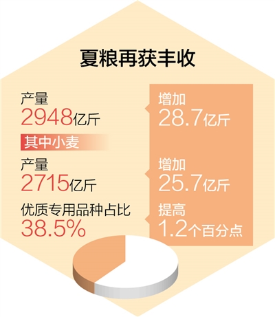 北京師范大學(xué)中國鄉(xiāng)村振興與發(fā)展研究中心主任張琦表示:“夏糧豐收離不開‘藏糧于地’‘藏糧于技’戰(zhàn)略的全面實施,今年夏糧播種面積達3.98億畝,比上年增加138萬畝,夏糧畝產(chǎn)比上年提高2.3公斤,單產(chǎn)提高對增產(chǎn)的貢獻達64%。”