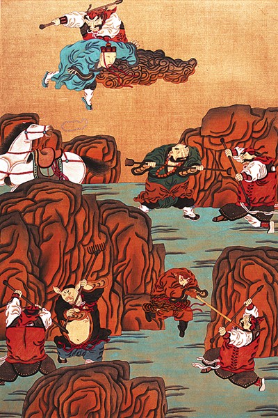 《西游記·車遲國》是周京新“西游”系列中的一幅,描繪了唐僧師徒取經(jīng)路上路過車遲國,與虎力、鹿力、羊力三個妖怪斗法的場景。在他的創(chuàng)作中,中國畫的工筆與寫意并非涇渭分明,體現(xiàn)了“以工養(yǎng)寫”的思考,人物造型緊湊結(jié)實(shí)而又不乏詼諧的生趣,山石樹木屋宇乃至黑霧祥云均有裝飾意趣。