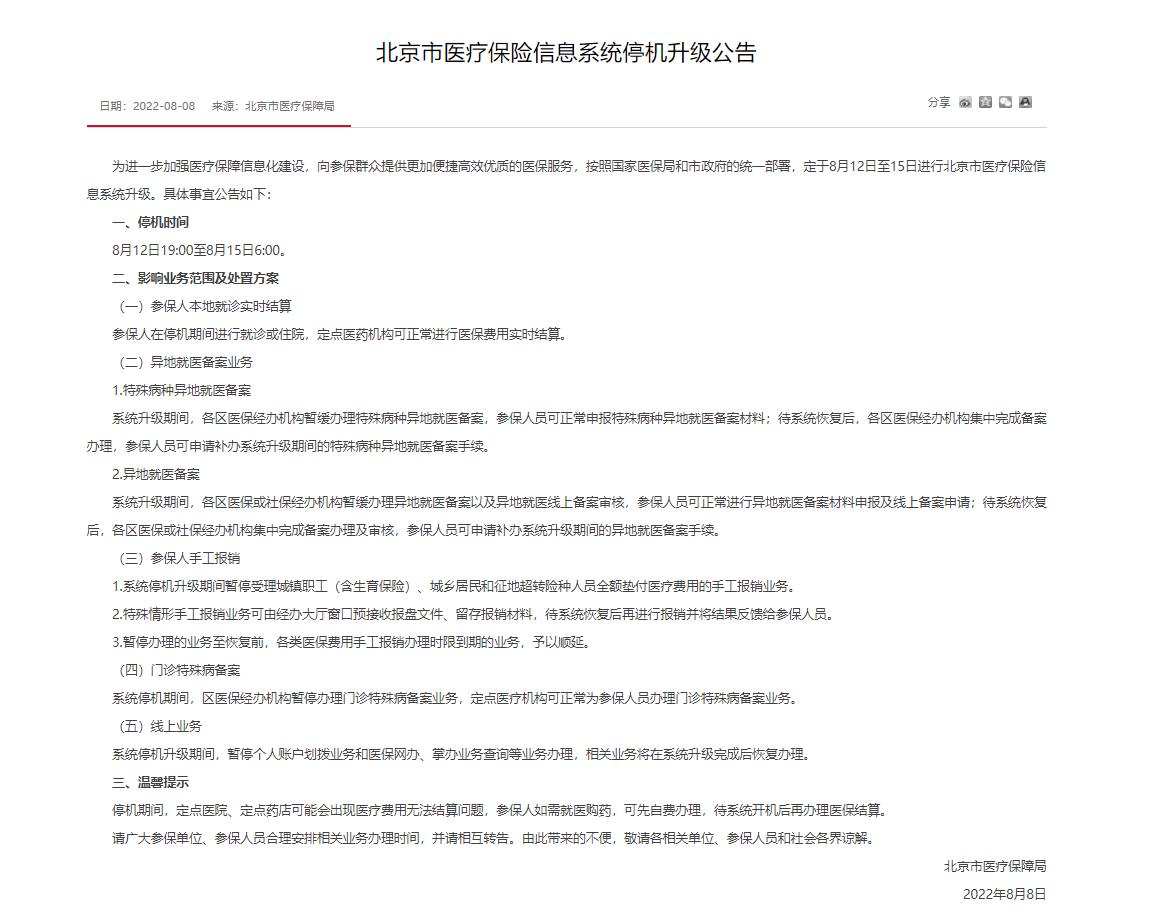 北京醫(yī)保信息系統(tǒng)將停機(jī)升級 部分醫(yī)保業(yè)務(wù)暫緩辦理