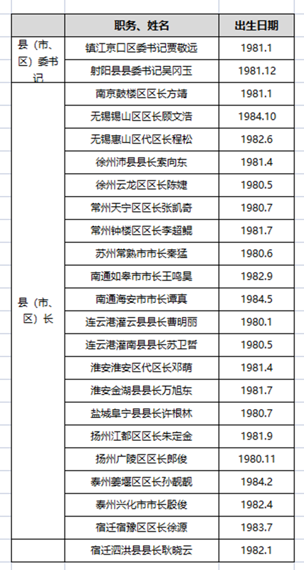 目前,江蘇共有23名“80后”縣(市、區(qū))黨政主官,最年輕的是出生于1984年10月的無錫錫山區(qū)區(qū)長顧文浩,最年長的是連云港灌云縣縣長曹明麗,出生于1980年1月。23人中,17名男性,6名女性。