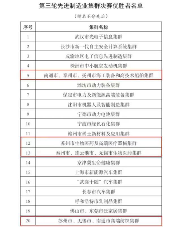 自2019年啟動(dòng)先進(jìn)制造業(yè)集群培育工作以來(lái),工信部圍繞新一代信息技術(shù)、高端裝備、新材料、生物醫(yī)藥等重點(diǎn)領(lǐng)域,搭建集群間相互比拼的“賽場(chǎng)”。此次江蘇入選的先進(jìn)制造業(yè)集群分別是:南通市、泰州市、揚(yáng)州市海工裝備和高技術(shù)船舶集群,蘇州市生物醫(yī)藥及高端醫(yī)療器械集群,泰州市、連云港市、無(wú)錫市生物醫(yī)藥集群,蘇州市、無(wú)錫市、南通市高端紡織集群。
