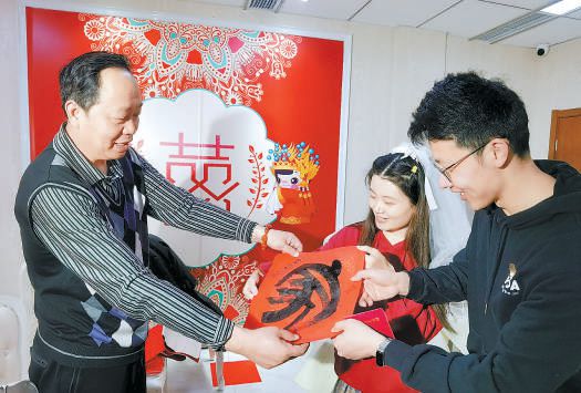 昨天,在石景山區(qū)婚姻登記處,新人收到飽含祝福的書法作品。 本報(bào)記者 吳鏑攝