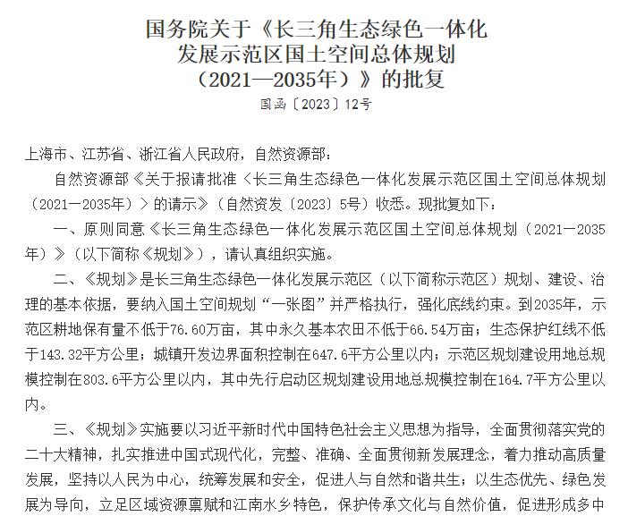 人民網(wǎng)杭州2月22日電 (記者張麗瑋)記者從中華人民共和國(guó)中央人民政府網(wǎng)站獲悉,繼《全國(guó)國(guó)土空間規(guī)劃綱要(2021—2035年)》印發(fā)后,日前,首部經(jīng)國(guó)務(wù)院批準(zhǔn)的跨行政區(qū)國(guó)土空間規(guī)劃——《長(zhǎng)三角生態(tài)綠色一體化發(fā)展示范區(qū)國(guó)土空間總體規(guī)劃(2021—2035年)》(以下簡(jiǎn)稱(chēng)《規(guī)劃》)獲批,這將對(duì)深化“多規(guī)合一”改革精神、完善國(guó)土空間規(guī)劃體系具有重要的示范意義。