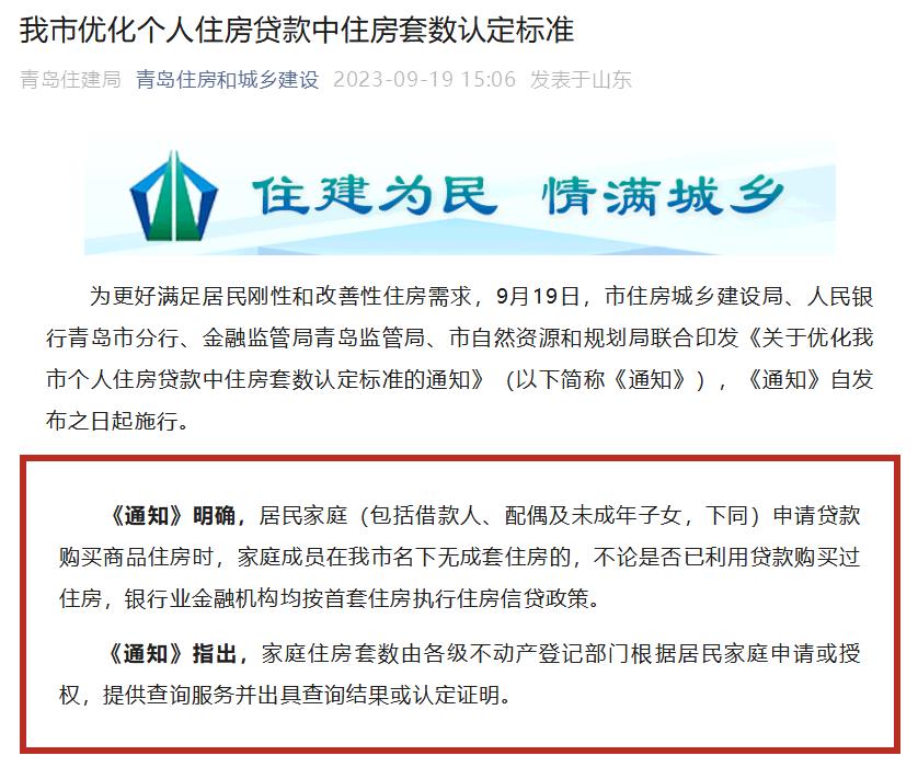 人民網(wǎng)濟(jì)南9月20日電 為更好滿足居民剛性和改善性住房需求,9月19日,青島市住房城鄉(xiāng)建設(shè)局、人民銀行青島市分行、金融監(jiān)管局青島監(jiān)管局、市自然資源和規(guī)劃局聯(lián)合印發(fā)《關(guān)于優(yōu)化我市個人住房貸款中住房套數(shù)認(rèn)定標(biāo)準(zhǔn)的通知》(以下簡稱《通知》),《通知》自發(fā)布之日起施行。