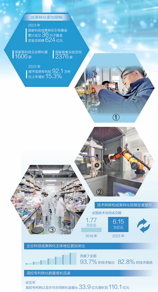 印發(fā)《“十四五”技術(shù)要素市場專項規(guī)劃》,從健全科技成果產(chǎn)權(quán)制度、強(qiáng)化高質(zhì)量科技成果供給等方面推動成果轉(zhuǎn)化;印發(fā)《專利轉(zhuǎn)化運用專項行動方案(2023—2025年)》,對專利轉(zhuǎn)化運用進(jìn)行專門部署;制定《高校和科研機(jī)構(gòu)存量專利盤活工作方案》,發(fā)揮市場和政府的協(xié)同作用,共同推動專利成果更好更快地轉(zhuǎn)化為現(xiàn)實生產(chǎn)力……近年來,一系列部署,一項項探索,讓創(chuàng)新鏈的好技術(shù)變成產(chǎn)業(yè)鏈的新應(yīng)用,科技創(chuàng)新正在成為培育發(fā)展新質(zhì)生產(chǎn)力的新動能。
