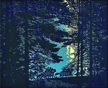 面對(duì)彼時(shí)套色木刻創(chuàng)作存在的這一問(wèn)題,晁楣通過(guò)不懈研究與探索找到了解決的方法。他放棄了過(guò)去以黑線勾勒輪廓再以彩色填充的方式,大膽采用色塊拼接的新方法,將黑色與彩色并置在畫(huà)面中,使黑色輪廓線融入暗部,統(tǒng)一為一個(gè)個(gè)整體色塊。晁楣強(qiáng)調(diào),套色木刻中不能沒(méi)有黑色,因?yàn)樗诋?huà)面中發(fā)揮著重要的作用。這種“剪影式”的構(gòu)圖大量削減了輪廓線在畫(huà)面中的應(yīng)用,帶來(lái)強(qiáng)烈的色彩對(duì)比以及極具視覺(jué)張力的疏密關(guān)系,使得畫(huà)面結(jié)構(gòu)主次分明,保持了作品的整體感。試看晁楣的套色木刻作品《北陲屏障》,逆光的環(huán)境中,頂天立地、枝繁葉茂的松樹(shù)剪影占據(jù)了畫(huà)面的大部分空間,在遠(yuǎn)處光源的照耀下,一隊(duì)騎乘戰(zhàn)馬的巡邏兵疾馳而過(guò),形成了動(dòng)靜交織的畫(huà)面節(jié)奏。作品用為數(shù)不多的色彩營(yíng)造光感,套色簡(jiǎn)潔自然,茂密枝干交織形成的無(wú)數(shù)小色塊,展現(xiàn)出藝術(shù)家精湛的運(yùn)刀技藝。