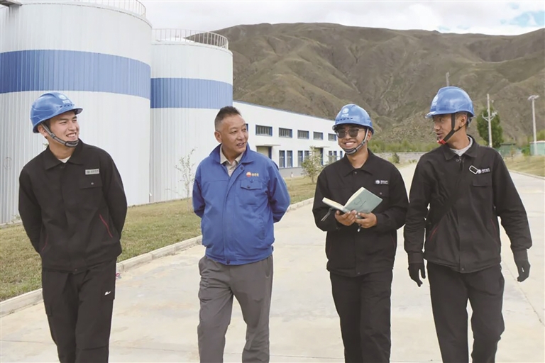 阿旺扎西(右)與同事在做檢修。