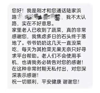 宋阿姨因患有脊髓性肌萎縮癥常年臥床,身邊僅有一位同歲的陪護(hù)阿姨照料。疾病讓她對(duì)新鮮蔬菜的需求更為迫切:“因?yàn)镾MA患者的肌肉是萎縮的,我都是要用開(kāi)塞露才能大便的,然后還需要陪護(hù)阿姨狠狠壓我的肚子。我為什么著急呢?如果沒(méi)有這些蔬菜吃,萬(wàn)一我堵住了,就會(huì)腸梗阻。陪護(hù)阿姨把蔬菜拿回來(lái)時(shí)我真的很感動(dòng),都要流眼淚了,好多的新鮮蔬菜正是我需要的,有青菜、萵筍、黃瓜……都是我跟他們說(shuō)過(guò)的,所以后來(lái)那天來(lái)了物資,我就馬上吃上蔬菜了?!?/p>