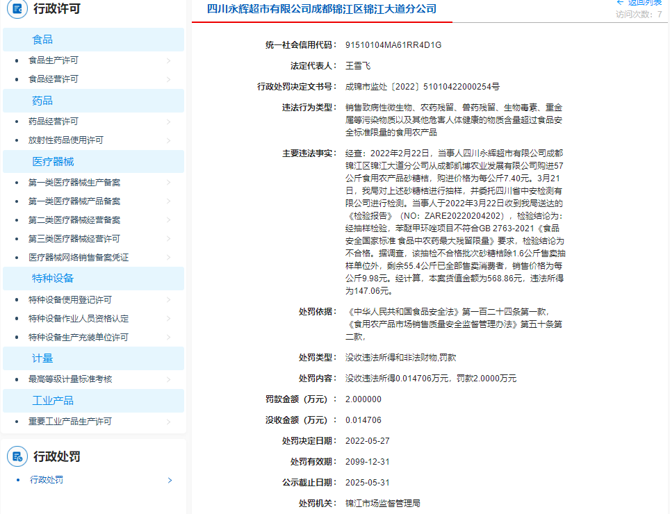 處罰決定文書顯示,經(jīng)查,2022年2月22日,當(dāng)事人四川永輝超市有限公司成都錦江區(qū)錦江大道分公司從成都凱博農(nóng)業(yè)發(fā)展有限公司購進(jìn)57公斤食用農(nóng)產(chǎn)品砂糖桔,購進(jìn)價格為每公斤7.40元。當(dāng)事人銷售的砂糖桔經(jīng)抽樣檢驗,苯醚甲環(huán)唑項目不符合GB 2763-2021《食品安全國家標(biāo)準(zhǔn) 食品中農(nóng)藥最大殘留限量》要求,檢驗結(jié)論為不合格。據(jù)調(diào)查,該抽檢不合格批次砂糖桔除1.6公斤售賣抽樣單位外,剩余55.4公斤已全部售賣消費(fèi)者,銷售價格為每公斤9.98元。經(jīng)計算,本案貨值金額為568.86元,違法所得為147.06元。