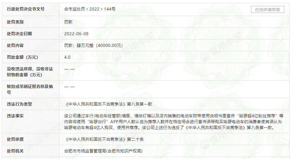 中國(guó)市場(chǎng)監(jiān)管行政處罰文書(shū)網(wǎng)顯示,2020年5月,哈啰所屬企業(yè)上海鈞正網(wǎng)絡(luò)科技有限公司違反了《侵害消費(fèi)者權(quán)益行為處罰辦法》第六條第(八)項(xiàng):“經(jīng)營(yíng)者向消費(fèi)者提供有關(guān)商品或者服務(wù)的信息應(yīng)當(dāng)真實(shí)、全面、準(zhǔn)確,不得有下列虛假或者引人誤解的宣傳行為:(八)夸大或隱瞞所提供的商品或者服務(wù)的數(shù)量、質(zhì)量、性能等與消費(fèi)者有重大利害關(guān)系的消息誤導(dǎo)消費(fèi)者”的規(guī)定,構(gòu)成了經(jīng)營(yíng)者向消費(fèi)者提供有關(guān)商品或者服務(wù)的信息不真實(shí)、不全面、不準(zhǔn)確的行為。綜上,上海市閔行區(qū)市場(chǎng)監(jiān)督管理局對(duì)上海鈞正網(wǎng)絡(luò)科技有限公司處以罰款4000元。
