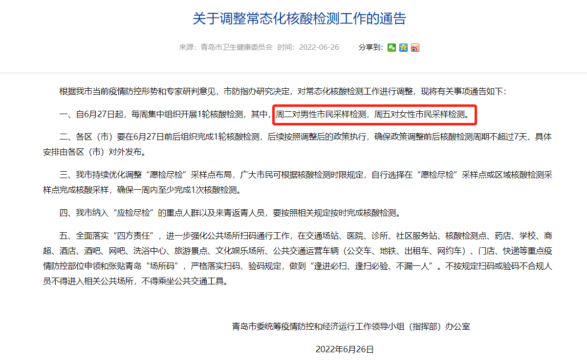 對此,青島市衛(wèi)健委回應(yīng):采用男女分開檢測,主要是借鑒大連等相關(guān)城市的經(jīng)驗做法。依據(jù)奧密克戎毒株傳播特點,將家庭和單位作為防控單元,男女分開檢測相當(dāng)于每周對該防控單元進行2次健康監(jiān)測,在同等人力、物力投入下,在滿足7天一輪檢測的目標(biāo)的前提下,實現(xiàn)了篩查頻次的倍增,有利于盡早發(fā)現(xiàn)風(fēng)險,節(jié)約成本、減少檢測機構(gòu)的壓力,提高檢測的敏感性和時效性。另男女分開檢測可減少檢測日采樣人數(shù),實現(xiàn)時間上的錯時錯峰,能夠減少市民排隊等候時間。