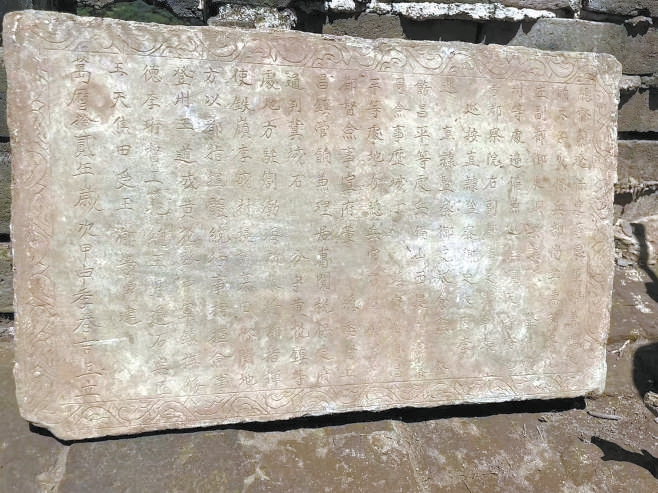 “發(fā)現(xiàn)一塊石碑,出土?xí)r碑文一面向下,推測(cè)這塊石碑原來鑲嵌在北側(cè)垛口墻內(nèi)側(cè),墻體傾斜倒塌后,石碑脫落?!表?xiàng)目考古負(fù)責(zé)人、北京考古研究院副研究員尚珩介紹。石碑為青石材質(zhì),保存完整,邊框刻著纏枝卷草紋。因?yàn)槊撀鋾r(shí)碑文面朝下,因此碑文保存完好,字體為繁體字,字跡娟秀,清晰可辨。
